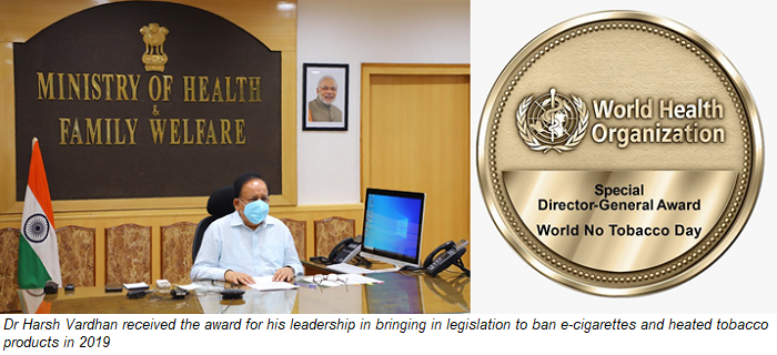 New Delhi, 31 May 2021: Dr Harsh Vardhan, Union Health and Family Welfare Minister, has been conferred the WHO Director-General’s Special Recognition Award for his invaluable leadership in accelerating tobacco control efforts in India.
