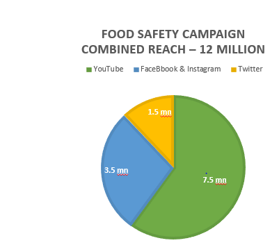 WHO India’s initiated a digital campaign on food safety in June 2022 to create public awareness amongst the public as well as food business on reducing the burden of foodborne diseases. The combined reach of the campaign on YouTube, Facebook, Instagram and Twitter was over 12M (1.2 crores) as of June 2022. The campaigns messages reached out to — 7.5M people on YouTube, 3.5M on Facebook and 1.5M on Twitter.