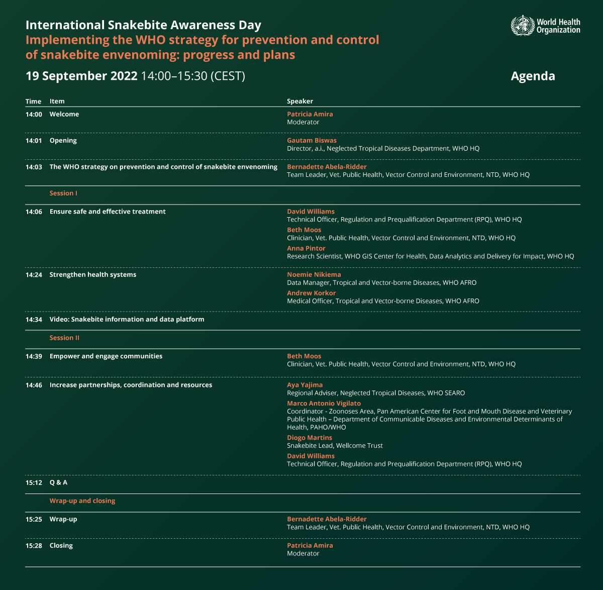 Building on this momentum, and coinciding with International Snakebite Awareness Day, WHO will host a second public webinar on 19 September 2022 at 14:00 (CEST), with the aim of presenting an update on the implementation of the strategy.